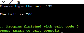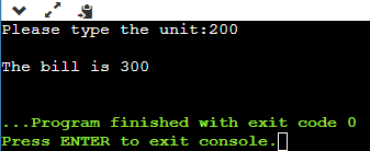 এবার if কন্ডিশন দিয়ে বলেদিলাম যে যদি ইনপুট দেওয়া ইউনিট ১০০ এর কম হয় তাহলে বিল হবে ২০০। যেটা প্রিন্ট ফাংশন এর মাধ্যমে আউটপুট এ দেখানো হবে।