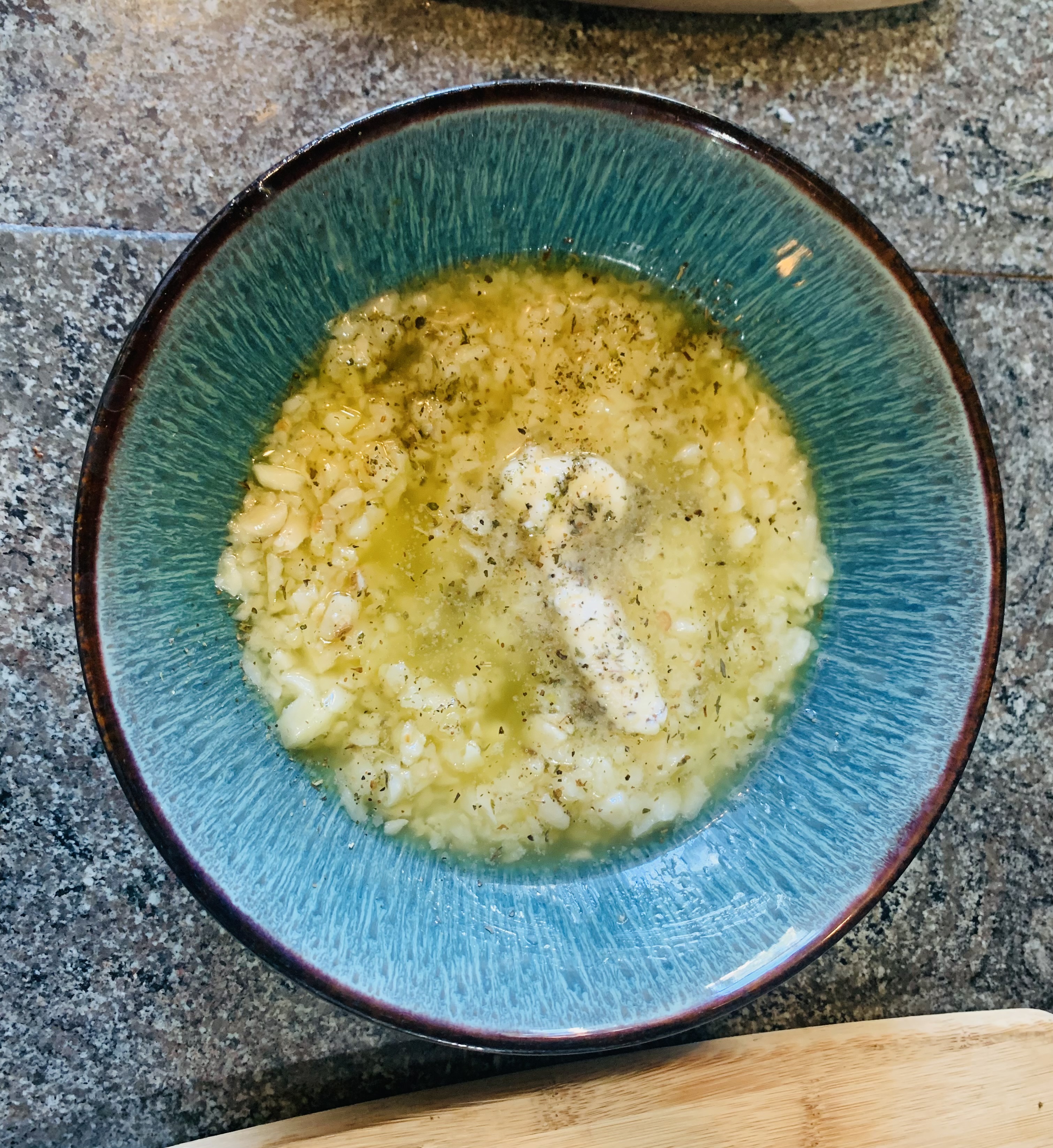 - 将蒜头🧄剁成蒜蓉,加入一块奶油放入微波炉加热至溶化,然后撒上一勺胡椒粉调成料汁;