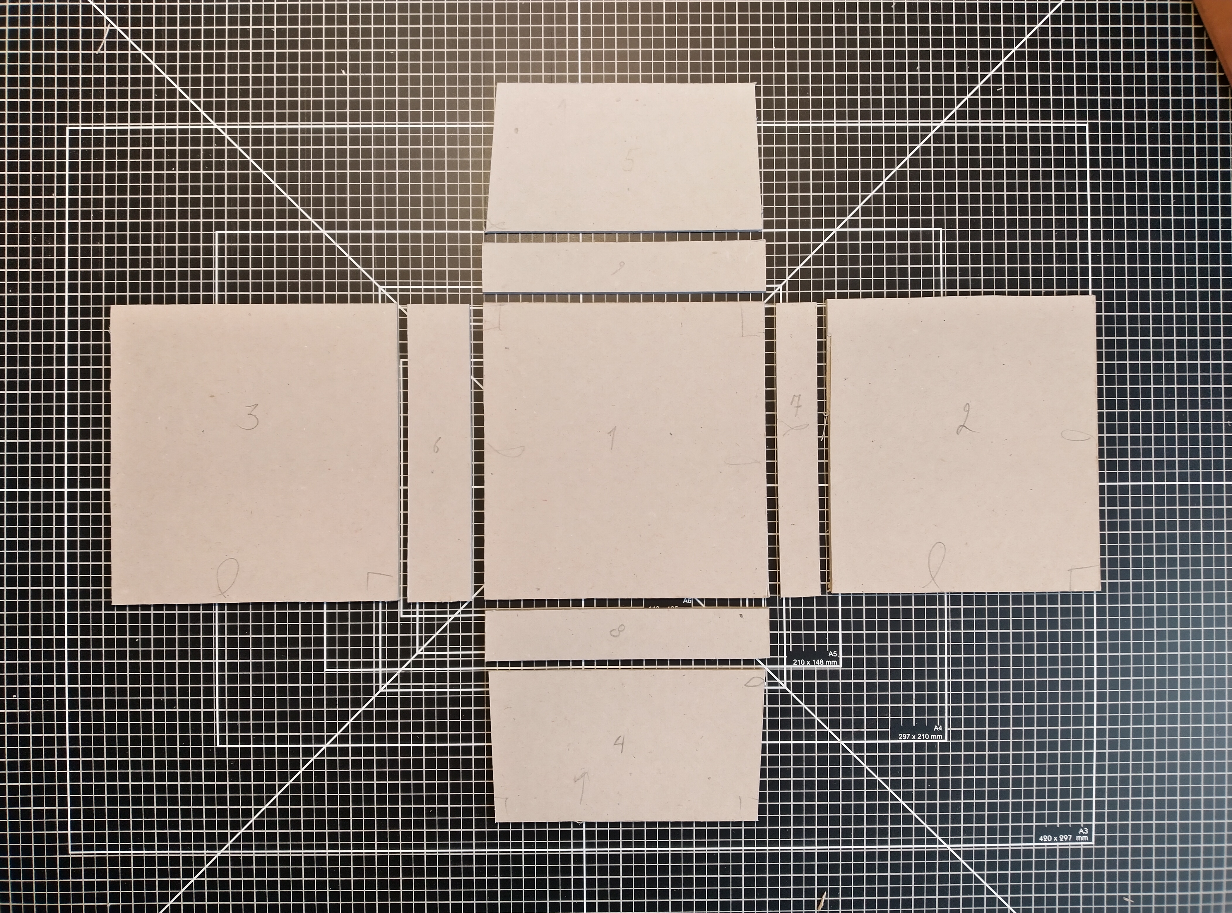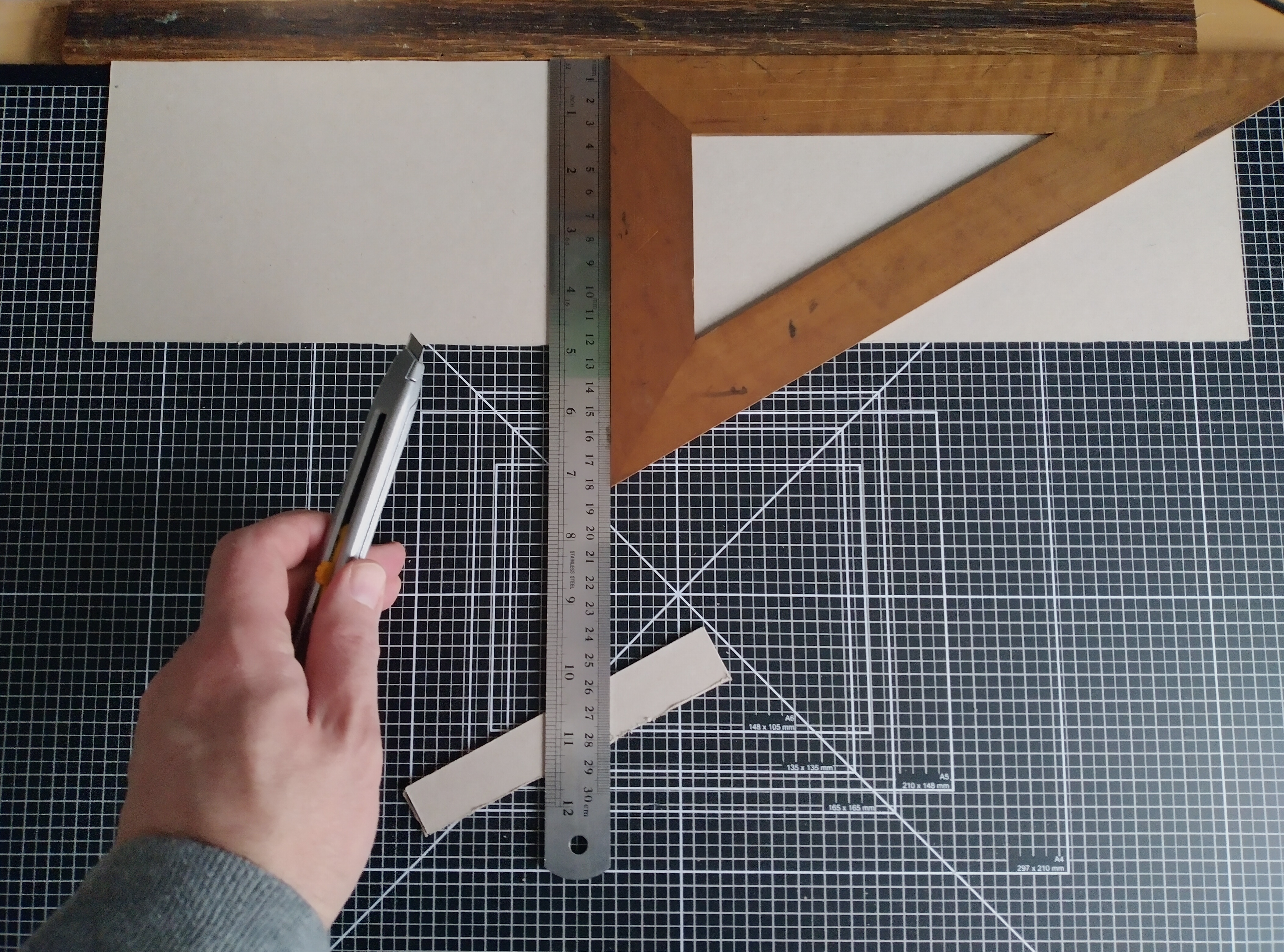 After taking measurements from the reels, I cut panels out of greyboard. I use a squared triangle to cut at 90 degree angles and a steel ruler to cut against.