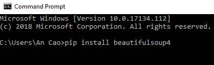 Đầu tiên các bạn có thể cài đặt Beautiful Soup bằng lệnh pip trong Command Prompt(cmd) của window mà bạn đang sử dụng. Thư viện này, nó đều được làm việc trên cả python 2 và python 3.