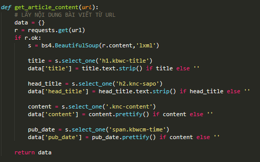 Mình dựa vào HTML mình phân tích để mình viết một hàm để lấy các thông tin như tiêu đề, mô tả ngắn, nội dung ngày đăng trong chi tiết của mỗi category.
