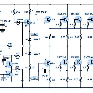 This is the schematic design of 300 Watt 724 Volt amplifier capable to deliver about 400W RMS power output in single channel. The component part list, PCB layout design and component placement layout is provided in this post. The power supply module already included ini the PCB design. The components are easily found in market. This circuit is using 8 transistors of 2SC5200 mounted in PCB, the heatsink is required and should be mounted in the power transistors to prevent overheat and maintain the amplifier’s good performance.
