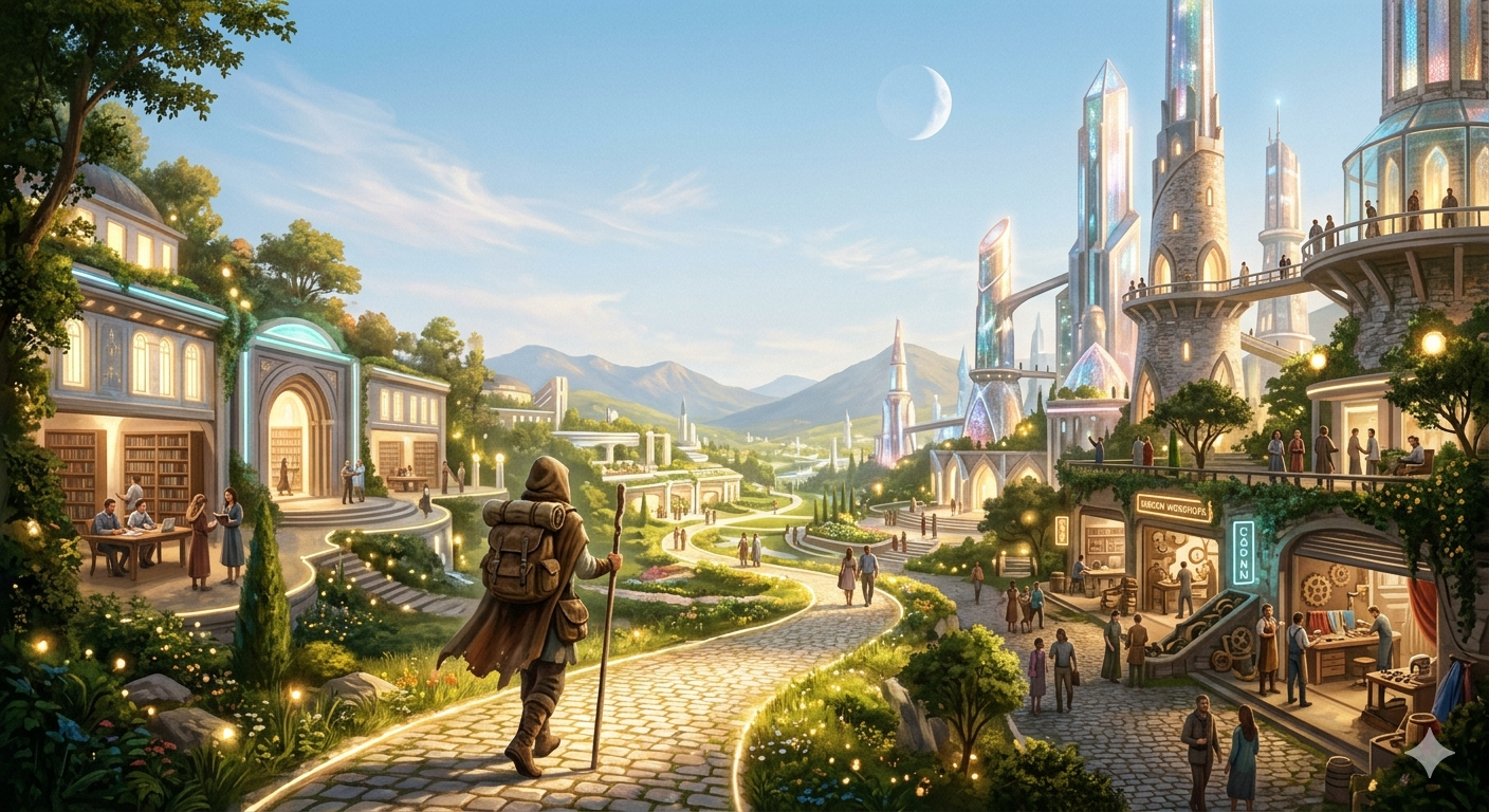 The scene concluded with the Wanderer standing in the bright afternoon light, positioned between the glowing Weaver’s Loom and the shining Sentinel’s Watchtower. Around them floated holographic symbols of open blueprints and magnifying tools, all set beneath the faint but visible curve of the waxing moon.