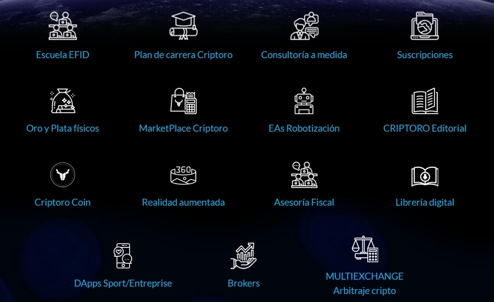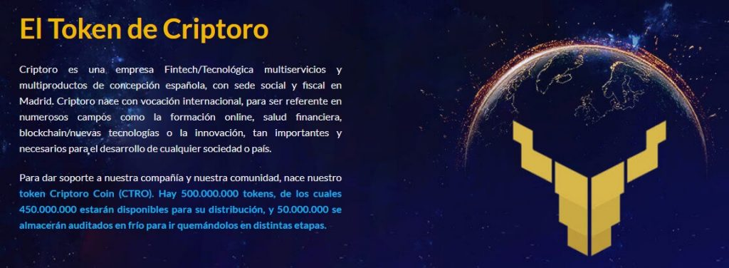 CRIPTORO is a Fintech multi-services and Spanish-concept multi-product company headquartered in Madrid. Cryptoro was born to be a reference for training, financial health, blockchain / new technology or innovation in a number of areas such as vital to the development and necessity of a society or country.