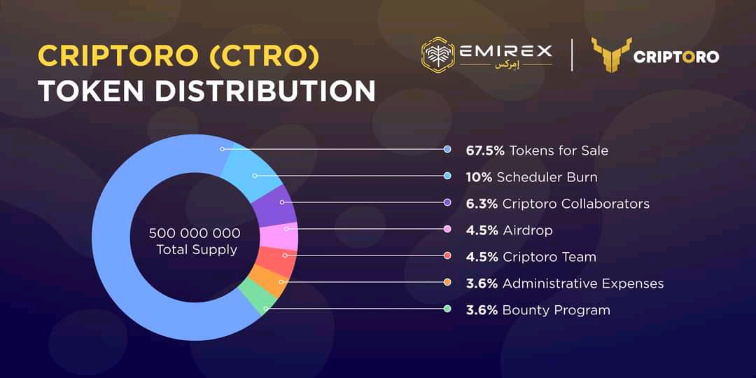 There are 500,000,000 Criptoro Coin (CTRO) tokens, of which 50,000,000 will be kept in a cold wallet until their programmed burning in several phases.
