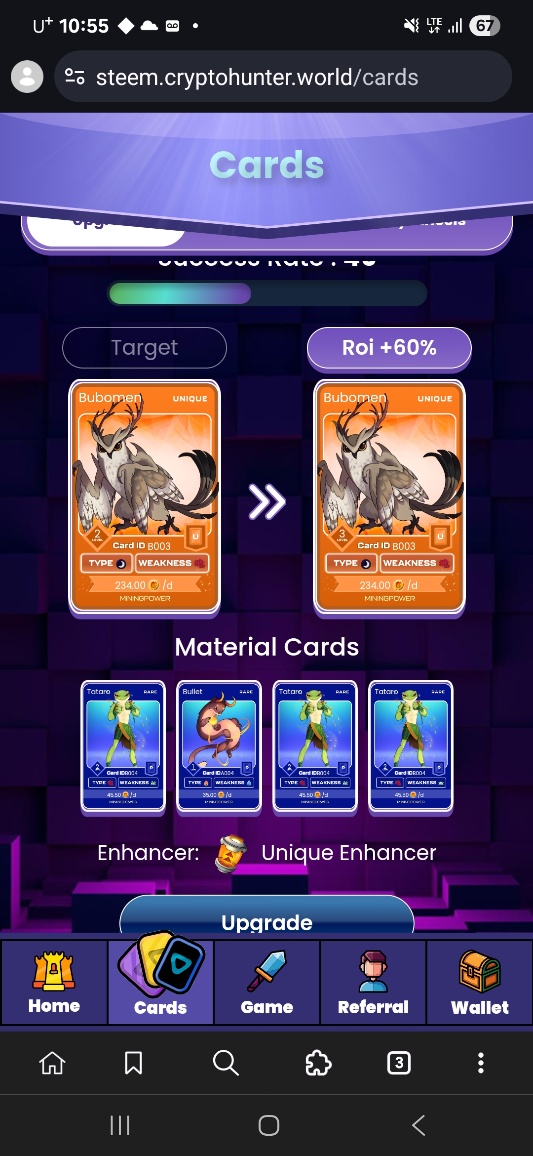 꽝을 기념하여 오늘은 레어카드 4장이 있어서 강화를 시도해보기로 했습니다.