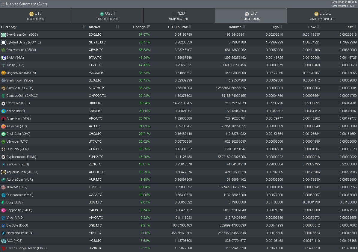 cryptopia volume 5 july 2018 ltcsteemCreated with Sketch.blockchainlives (45)in #crypto • 8 years ago altcoins v ltc sorted by biggest gains @ 9pm Australian time #cryptopia #markets #alt-coin #litecoin