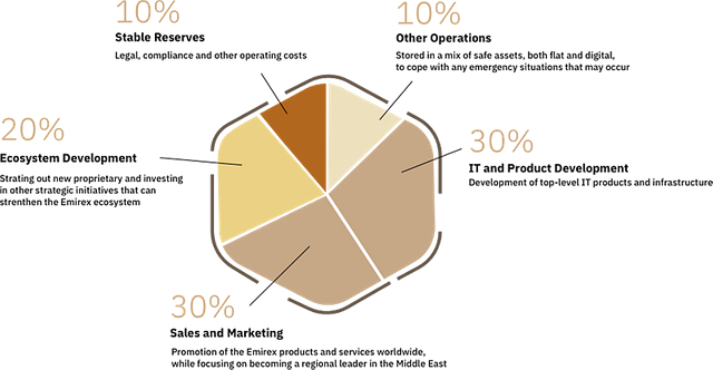 All the funds raised through the EMRX token offering campaign are to be used solely for development of the Emirex Group. Funds will be used in the following proportions: