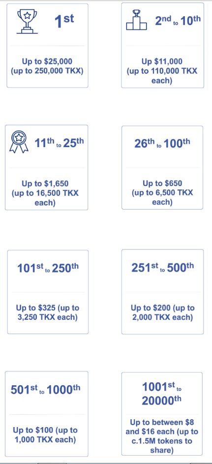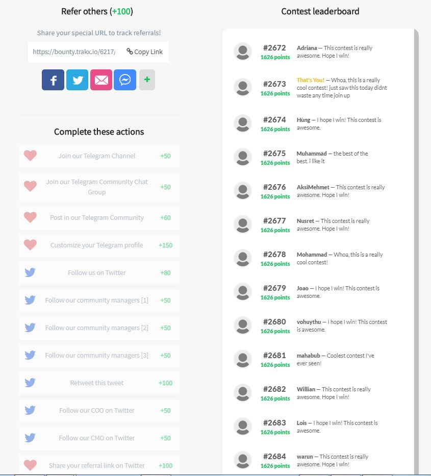 hello guys, its been a while, today i wanna talk about TRAKX.IO so unlike many others crypto hunters per sayin im not an expert when it comes to crypto world, i may atleast be an amateur soim goin to try to explain how awesome its been for me to be in this project, so i found about this project surfing on youtube bout crypto faucets i had stopped looking into cryptocurrency in while so i kinda did it cuz i didnt have anything else to do, so i found this video explaining that i would get tokens easily by signing in and completing some task that they would offer. so i said to myself "what do i have to lose instead of a couple of minutes, i dont have anything to do anyways", so i went there to see if its a real deal, i went to the website signed in, by the way their website its awesome, i like to code so whenever i see things like a website or software i try to analyze it it a habit that i have they are using a scrolling type site which is more techy i mean i like the clicking type site but scrolling its rising and its kinda resourceful so i signed it and went to the task so i could get well something out of this, i scrolled through the tasks and at the bottom i saw the prizes, DAMN, i had a BLANK moment whe i saw that the Nr1 would get $25K JUST BY COMPLETING tasks like "like our facebook page" or "follow us on twitter" or "write a blog about us on medium, steemit or any platform for blogging" which is why im doin this right now, so like almost any other airdrop youre gonna have to put some effort in this cuz youre not the only one after the grand prize theres tons of people after it and some already granted the first place which i believe its permanent if you get enough points from your tasks you will be able to surpass everyone and get to the first place, and one thing that will help you a lot its the referal system, so if you complete all the given tasks it will still not be enough to get to the first place, there its where the referal system enters , for each referal you get 100pt (points) so once you finish every task you may end up like i did til i read the referal system, its not easy to get referal even if youre a big hype among the crypto currency society cuz this project THE TRAKX.IO PROJECT its something that keeps getting people from all over the world by every second, with this post besides getting my task done i was hopping at first to get some referal for me but now that i think about it im afraid great part of people that are goin to read this has already embarked in this journey, im going to put some pictures of the TASKS, LEADERBOARD AND PRIZES, guys, specially for those like me who didnt ever have a chance to get a single BITCOIN this is a great opportunity i wouldnt waste it, im not wasting it i will put my referal link just i case, the airdrop will end i dont know a couples of days from now, anyhow go now if youre reading this TRAKX is awesome.THE PRIZES
