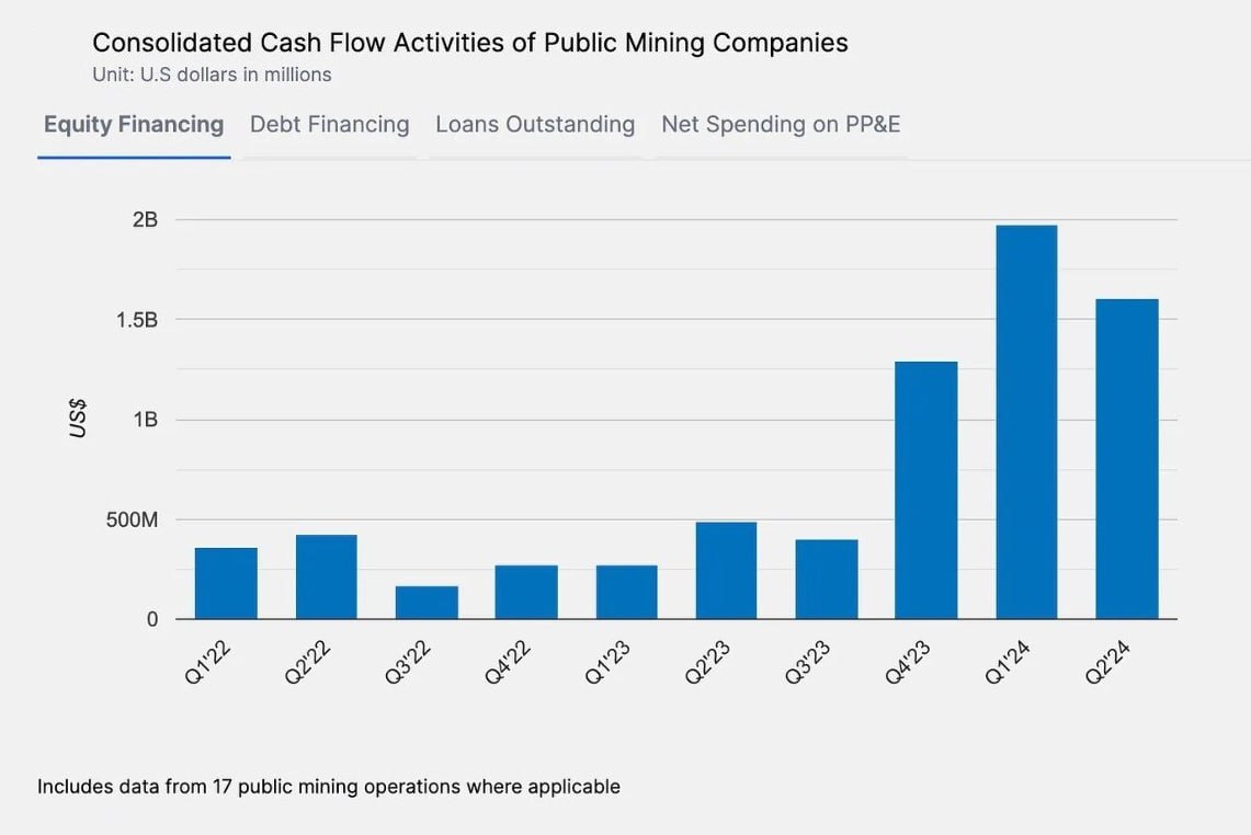 CRYPTO UPDATEfutu (28)in #crypto • 2 years ago ⛏ Public mining companies raised $1.6 billion in the 2nd quarter of 2024. The majority of this amount came from the sale of their own shares. 🪬 Crypto Mason