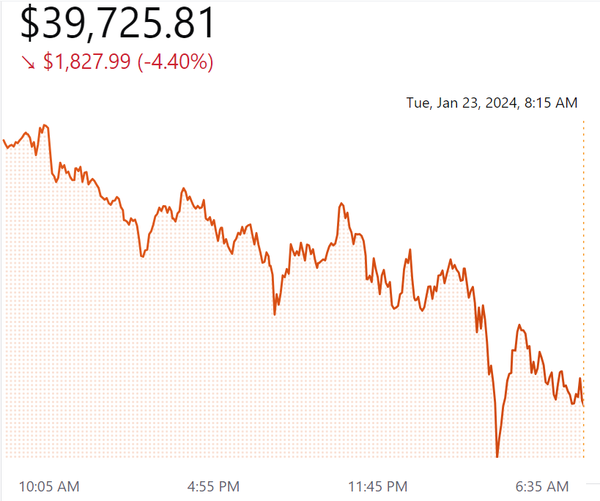 지난 10일 미국 증권거래위원회(SEC)가 비트코인 현물 상장지수펀드(ETF)의 미국 증시 상장을 승인한 직후 짧은 랠리를 펼친 비트코인은 내리 조정받는 중이다. 지난 11일 4만7076.78선까지 뛰었다가 23일 현재 4만선까지 위협받고 있다.