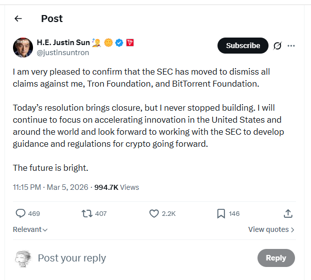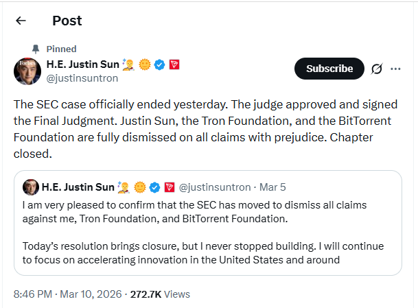 SEC: Justin Sun, the Tron Foundation, and the BitTorrent Foundation are fully dismissed (2026-03)