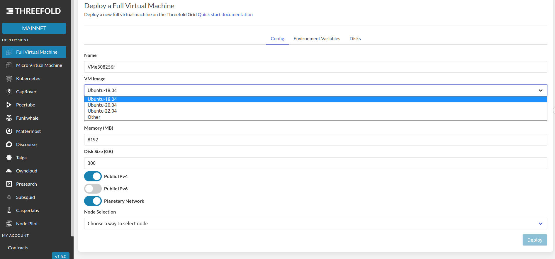 • Once you receive funds, deploy a Full Virtual Machine. Configure it with at least 4 vCPU, 8 GB RAM and 300 GB disk. Activate  at least IPv4 and IPFS, scroll down to select the latest Ubuntu version and choose a working node to deploy your VPS (node 1 seems to work well).
