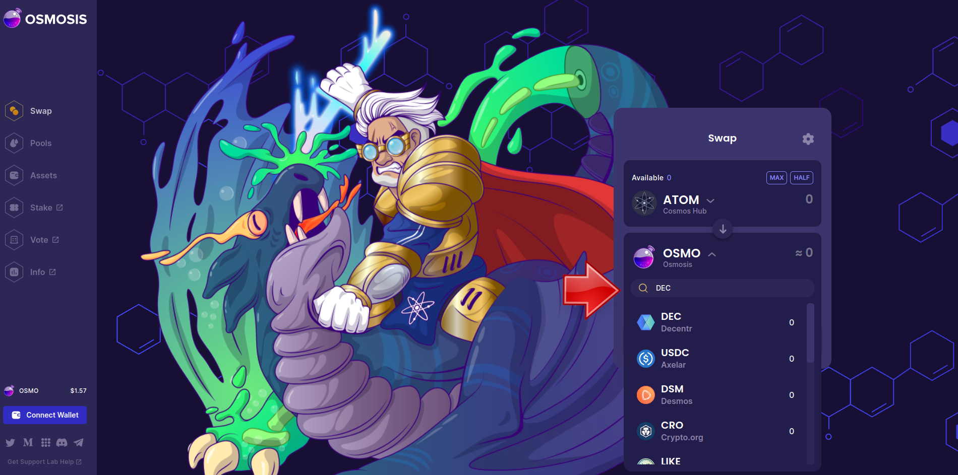 • Once the transaction is complete, which usually takes seconds , you will see your assets appear. Now go to the swap option on top of the left menu. Search for DEC and the amount you want to swap (MAX for all your assets).