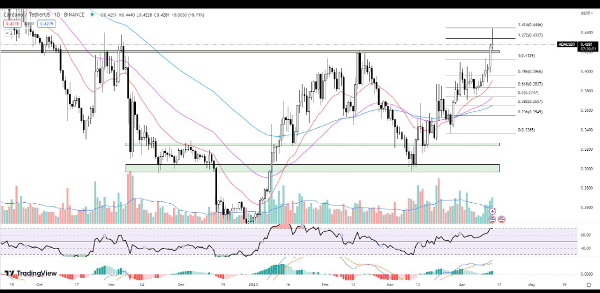 Cardano, considered an “eco coin” by many, has seen its price jump by 11% for the past week as Ethereum’s Shapella upgrade fuels a general recovery in the market. This bullish trend has not only bolstered Cardano but also Bitcoin, Dogecoin, and Solana, as they have all enjoyed significant gains recently.