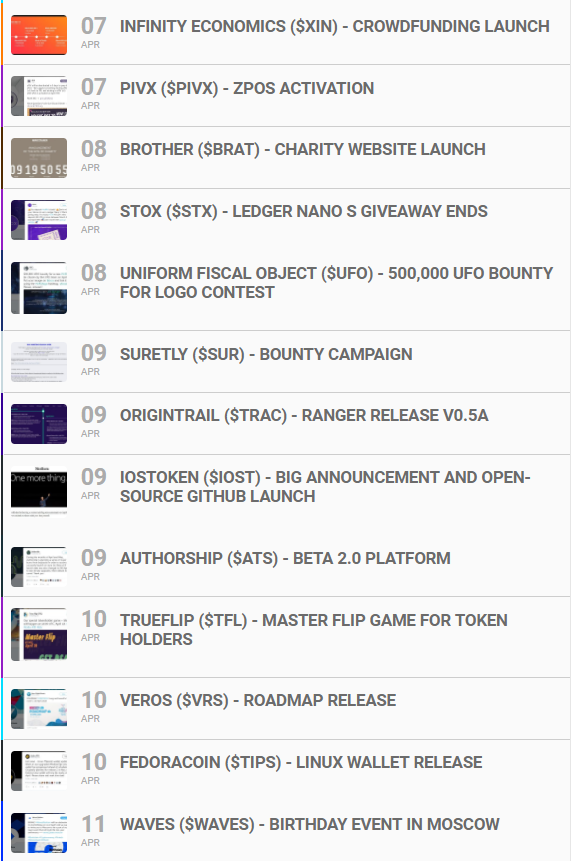 [코인일정] 4월 5일 - 4월 12일roiice (25)in #crypto • 8 years ago 4월 5일 ~ 4월 12일 주요 일정 공유드립니다. (본 일정은 글로벌 시간 기준입니다. 한국과 24시간 정도 차이가 발생할 수 있습니다.) 4월 5일 ADA : 로드맵 업데이트 LEDN : 테스트넷 4월 6일 EOS : 홍콩 밋업 / Dawn 3.0 릴리즈 XMR : 하드포크 일정 RISE : 뉴 로드맵 발표 / 뉴 웹사이트 4월 10일 XLM : 샌프란시스코 밋업 4월 12일 XRP : LST 홀더 에어드랍 감사합니다. #blockchain #calendar #bitcoin #eth