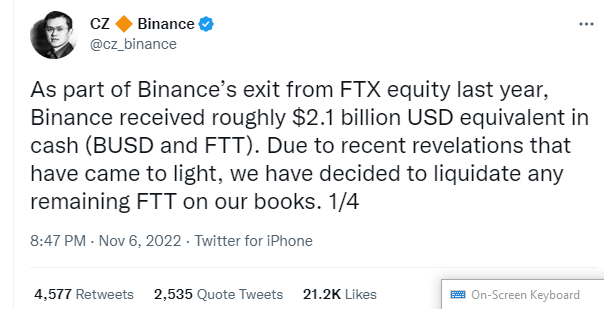 바이낸스는 2019년부터 가지고 있던 FTX의 초기 지분에서 작년 출구의 일환으로 FTT의 자금을 받았습니다. FTX는 FTT와 BUSD의 21억 달러 혼합(바이낸스 고유의 스테이블 코인)을 통해 회사에 대한 바이낸스의 지분을 사들였습니다. 교환 - Zhao의 진술에 따르면.