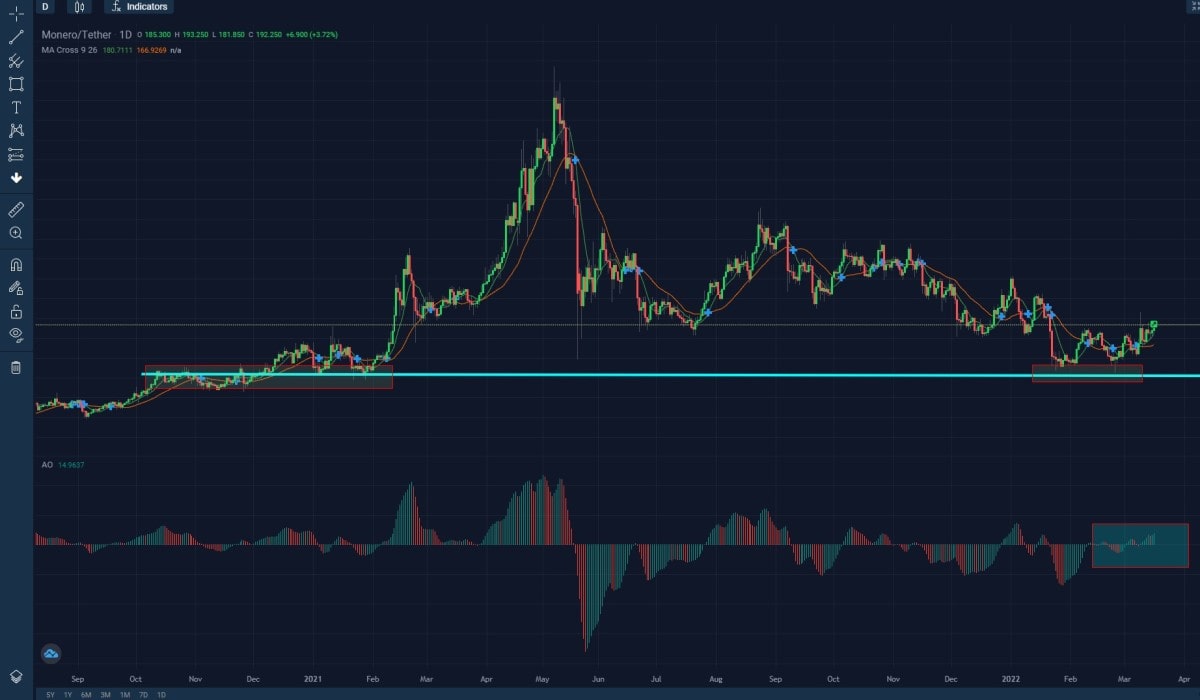 - The 9/26 MA cross occurred on 7 March and isn't showing any signs of switching back to a bearish trend.