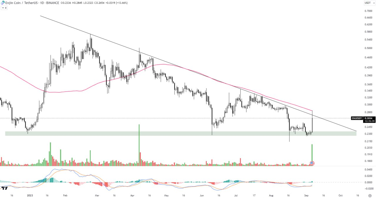 ENJ is moving in a descending triangle. It bounced with a high volume from the horizontal support and attempted to break out the descending triangle, where it faced the MA 100.