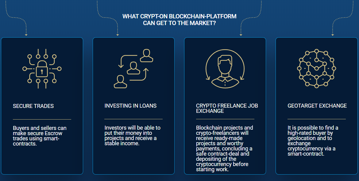 Crypt-ON is the project where people meet, make safe purchases in cryptocurrency, borrow cryptocurrency for their projects, find employers and freelancers for their tasks and get reward in cryptocurrency. This is not just another ordinary exchange platform, it is a complex peer-to-peer (p2p) crypto platform, designed to evolve into a full-cycle crypto DAO-system.