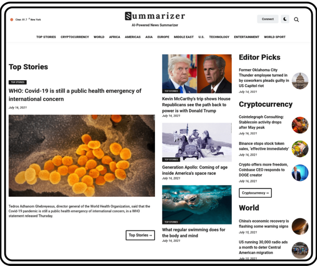 Summarizer стремится сделать ваши ежедневные новости короче за счет использования ИИ. Его боты сканируют Интернет в поисках новостей, обобщают их, а затем сортируют по категориям. Вам нужно всего лишь зайти на сайт https://summarizer.co/ . На главной странице находятся самые важные, интересные и чрезвычайные новости, которые недавно произошли. Также отфильтровать новости по категориям: криптовалюта, финансы, технологии, спорт и т.д.
