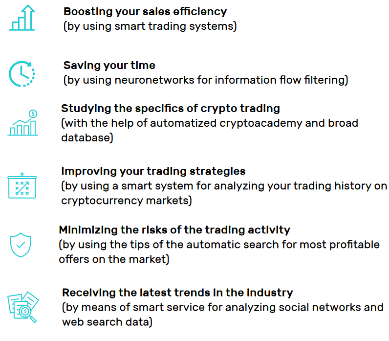 The idea behind this project is very clear and simple: to create a holistic ecosystem that will contain all the necessary tools for users with any level of experience and knowledge in the field of cryptocurrencies.
