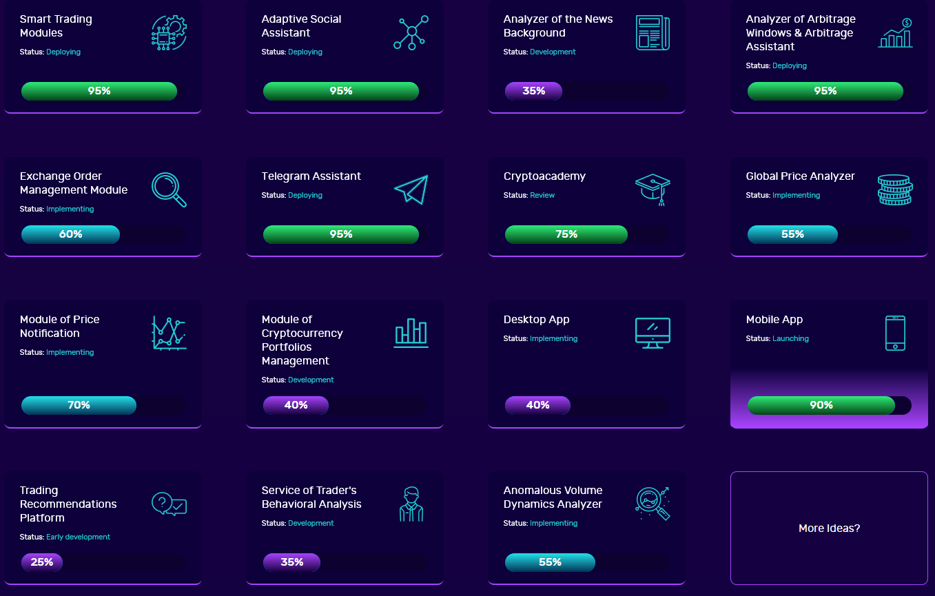They already have currently running projects based on algorithms for automatic trading on cryptomarkets, they gave a great and valuable experience and therefore we moved on to fulfill more ambitious goals.