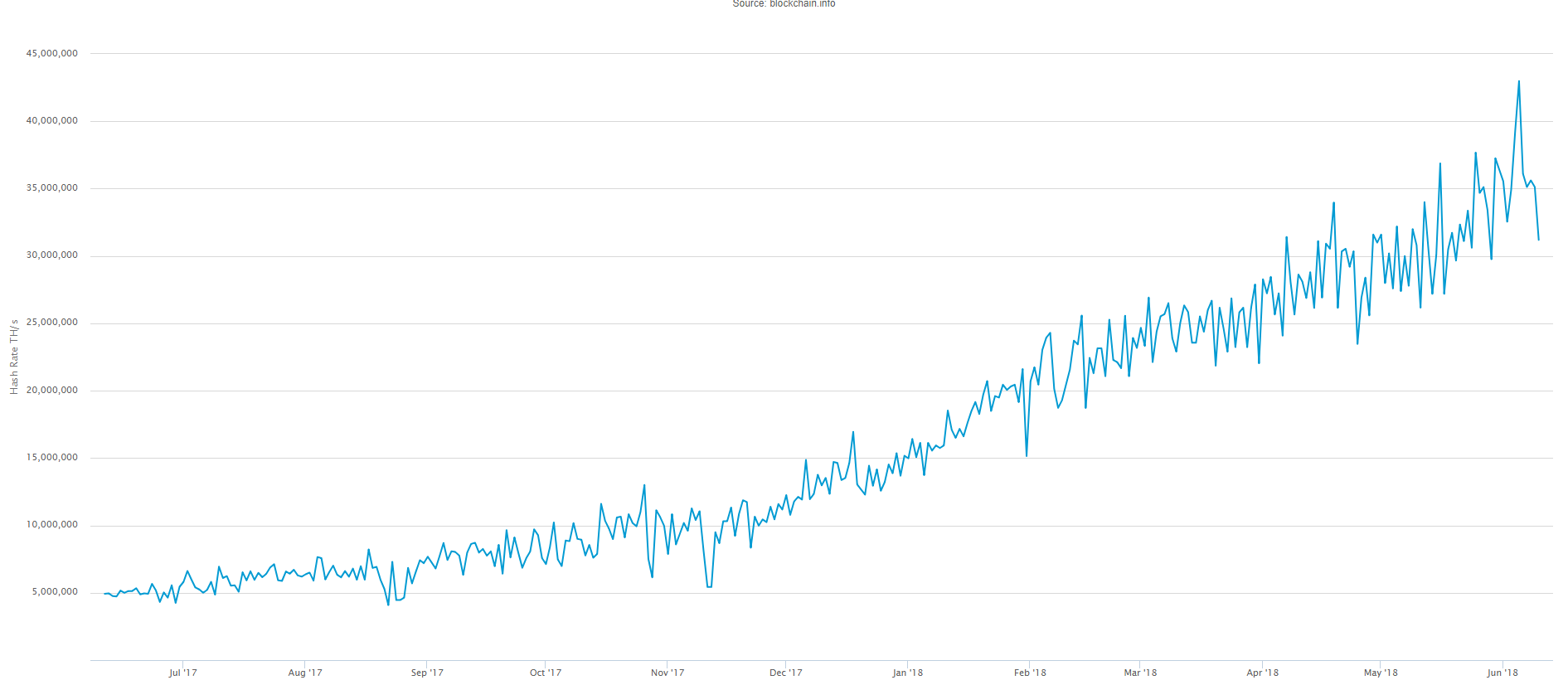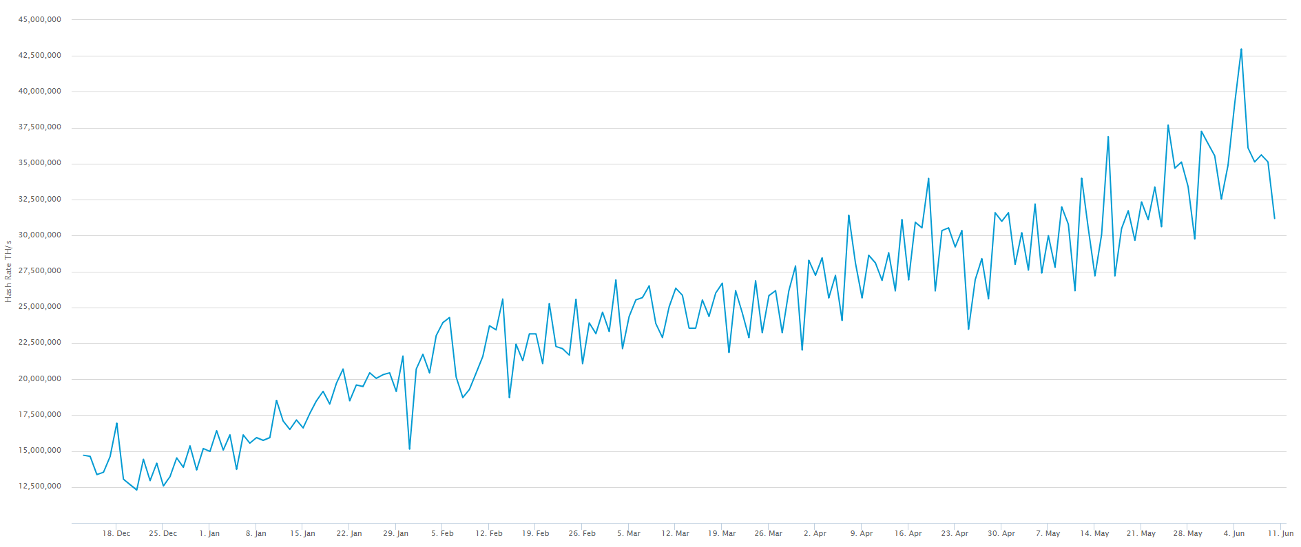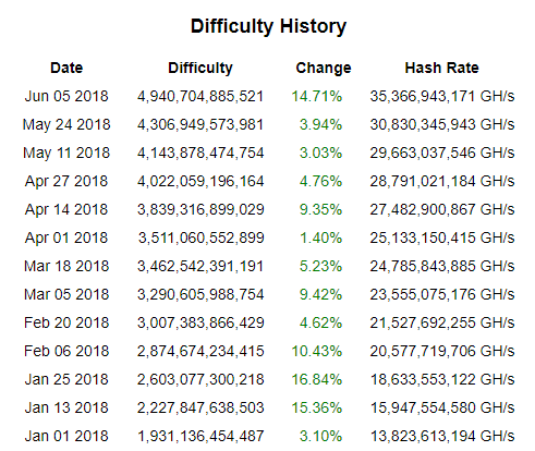 In fact; the last difficulty adjustment (the self-adjustment to the BTC blockchain carried out to compensate for changes in hash rate - BTC tries to maintain a block time of 10 minutes) on 5 June was a 14.71% increase. That's the third largest difficulty increase this year!