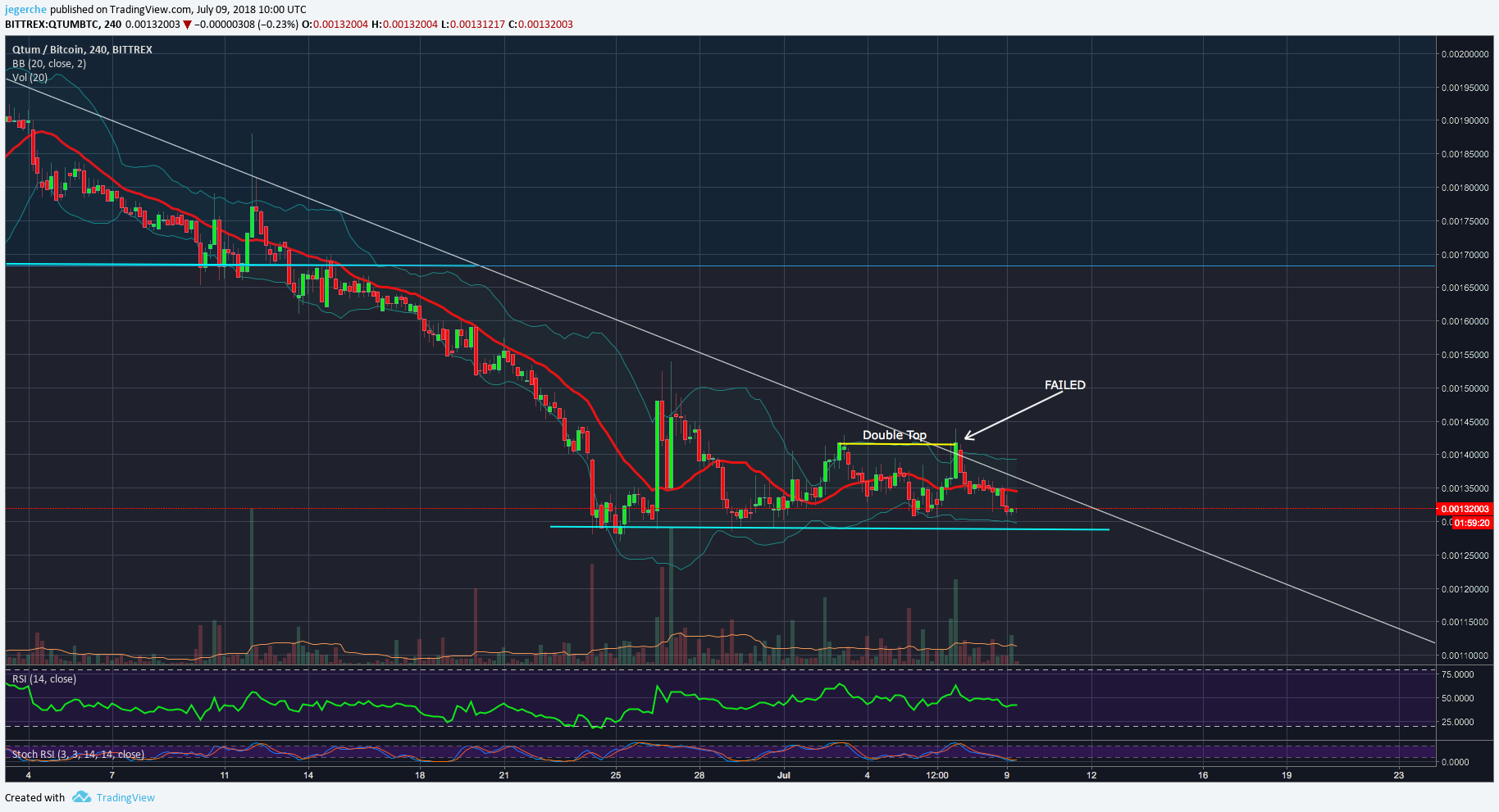 After the very big push, QTUMBTC entered a diamond shape formation and started a very deep-dive downtrend. It has bounced a few times and moved sideways, then hit the downtrend resistance again and got rejected there already multiple times, which is why it still in a downtrend.