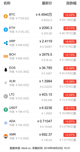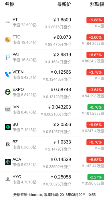 新币市场方面,市值流通TOP10中涨多跌少。其中涨幅中最明显的是BUMO和EXX Token,分别为9.96%和9.88%;跌幅中最明显的是HYCON和IVN Token,分别为2.27%和0.76%。