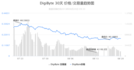 DGB一月内交易量随着价格的下跌而下降,从0.33元跌到最低点0.13元,不过照近几天的趋势来看有回暖的势头。