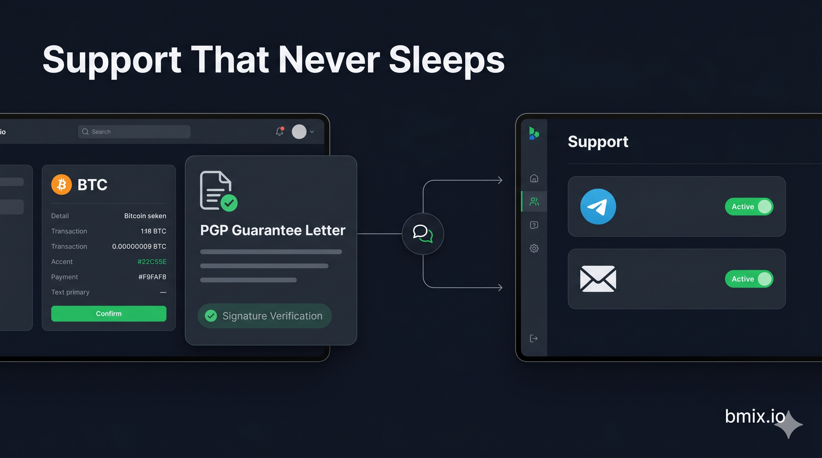 BMIX approaches this problem by combining continuous support availability with verifiable transaction proof. Instead of leaving users dependent on unclear communication channels, the platform integrates 24/7 multilingual assistance alongside a PGP-signed guarantee letter system.