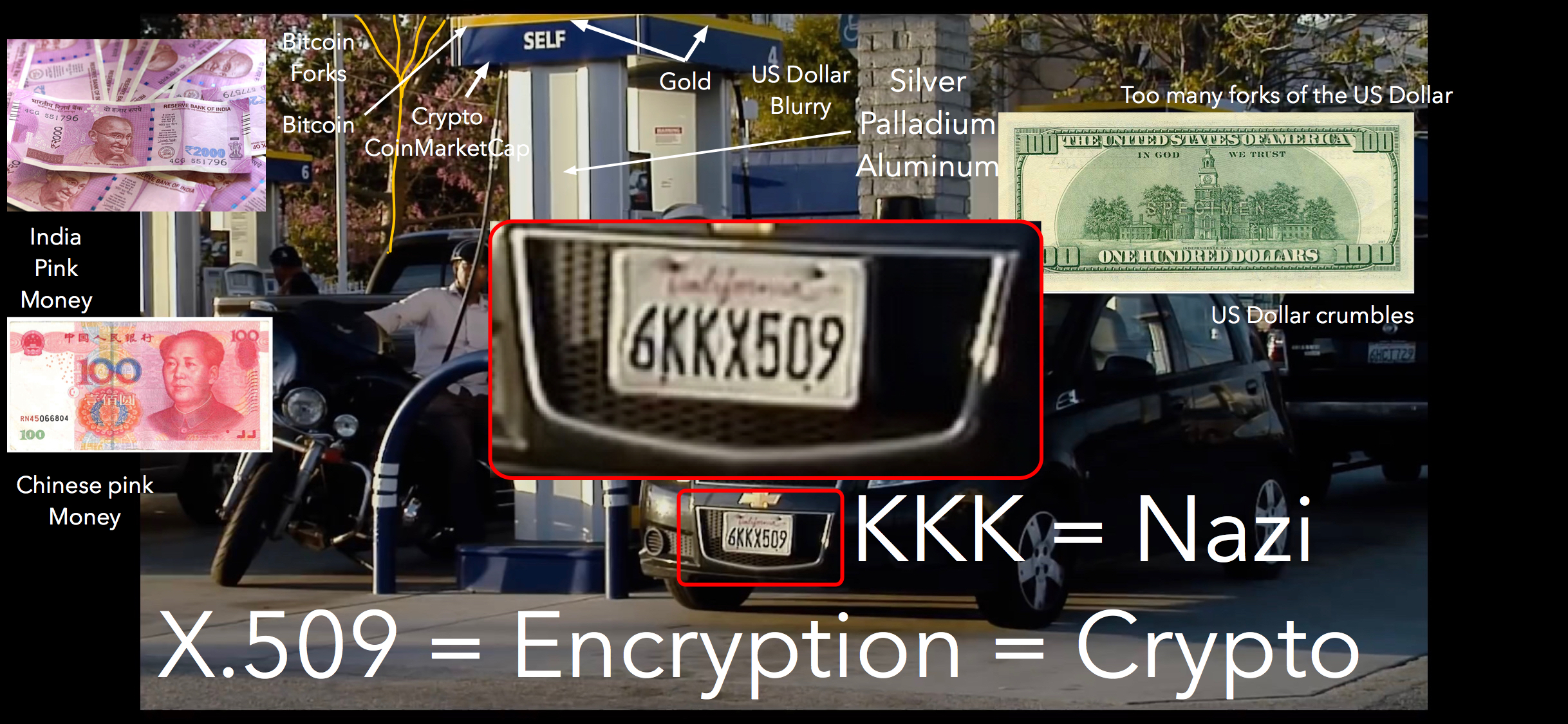 Let's just start with the money in this picture. You can see that this is about east vs. west, and crypto vs. petro-dollar, and hard vs. liquid assets. We can see Gold, Silver, and other precious metals going up. Notice that the US dollar crumbles like many forks in a crypto.