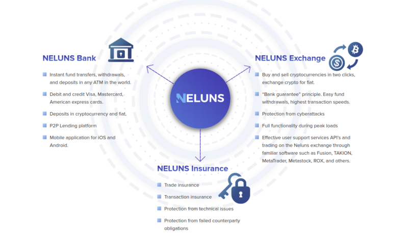 Neluns is the modern financial ecosystem, bringing together a bank that will operate both with fiat and crypto. Also, it will include itself a cryptocurrency exchange and insurance company, making the best conditions for the quality evolution of the cryptocurrency market.