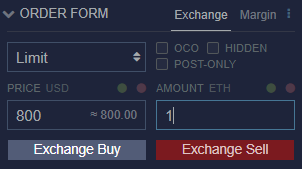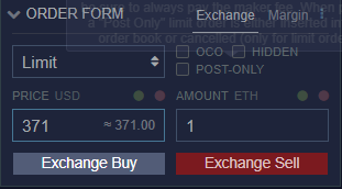 Now we place buy and sell orders from around these two lines. For this trade we aim to automatically buy Ethereum for $371 and sell for $800 to achieve a profit of $429. For example, go to the ORDER tab, select LIMIT ORDER. Type in 371 in the price box andtype in 1 ETH in the amount box