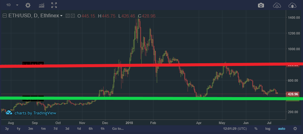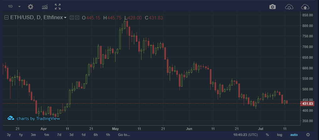 Looking at the chart: Each candlestick represents the highest and lowest points the currency traded at every day interval. On the top left of the chart we can see a box saying 1D which is the length of the candle stick or 1 Day. On the bottom is the overall time scale. In the chart above it runs from April 21 until July 11.
