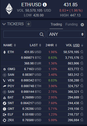 Pick a cryptocurrency from the tickers panel to bring up the chart. We are going to lookat Ethereum vs US Dollars, so click on ETH/USD to bring up the chart