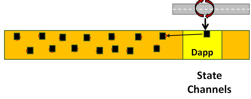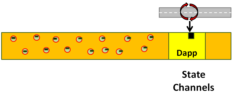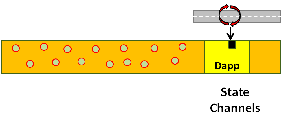 A state channel is like a side road. So the main Dapp is built on the Blockchain, like the classical model, however, the transaction is done not on the Blockchain, but off the Blockchain on the state channel.