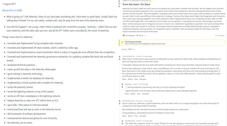 One thing just to quickly mention with regards to their team, a while ago, there was a brief scandal where an ex-technical lead by the name of Zack Hess wrote a strong accusatory post against Aeternity about not being paid or treated fairly. He has since left and started his own blockchain project called Amoveo.