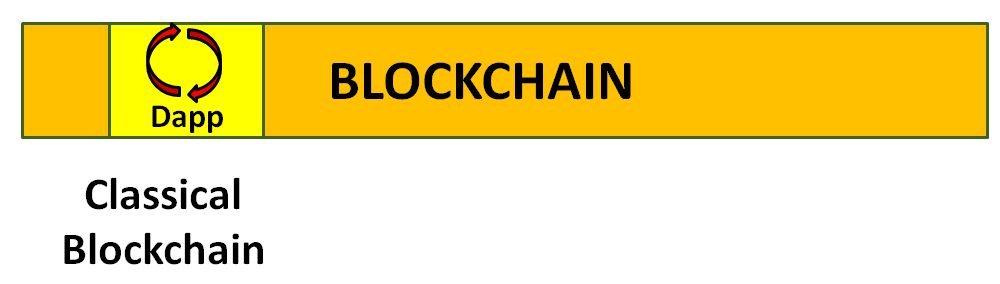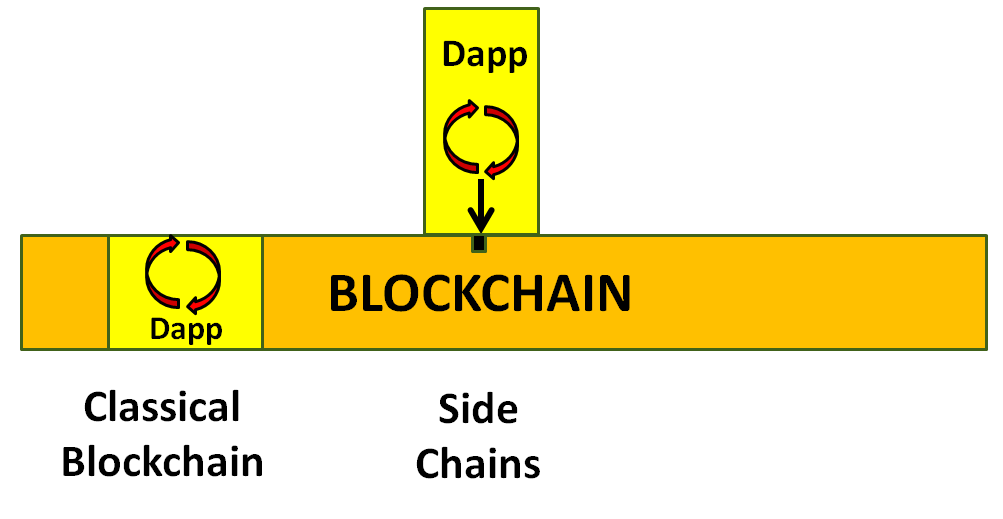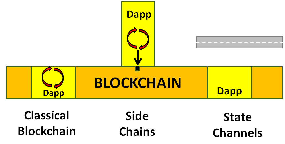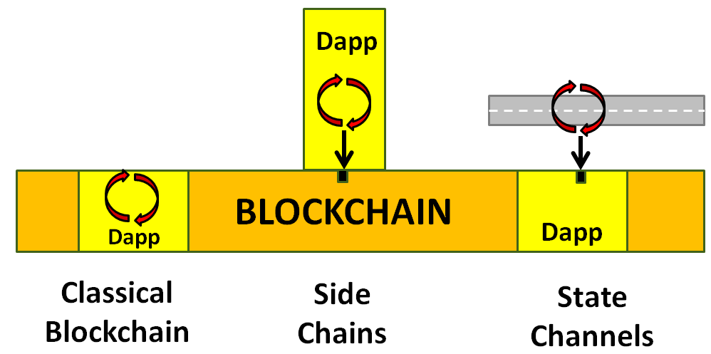 In a classical Blockchain, the Dapp (decentralised application) is built on the Blockchain, and any transactions that happen on the Dapp is done on the Blockchain using it’s computational power. This is very burdensome and slows down the whole Blockchain over time. Examples of classic Blockchains that use this are Bitcoin and Ethereum, and both of these Blockchain are running into problems with scaling. Problems with scaling means that as more Dapps are built on the Blockchain, the Blockchain is unable to keep up with the demand and the performance begins to slow down.