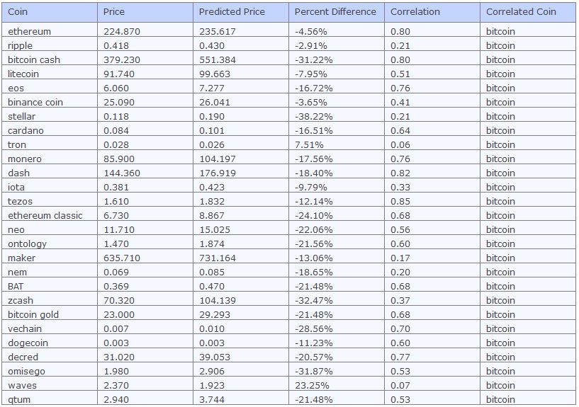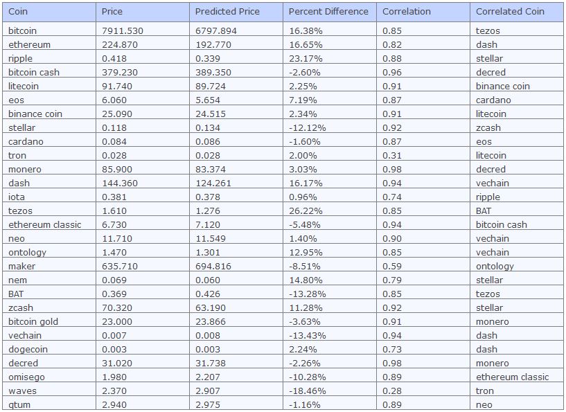 As you can see almost all Altcoins look undervalued compared to Bitcoin, either making these coins cheap, or Bitcoin expensive. It should also be noted that the correlation for many isn’t that strong, so these results need to be taken with a pinch of salt.