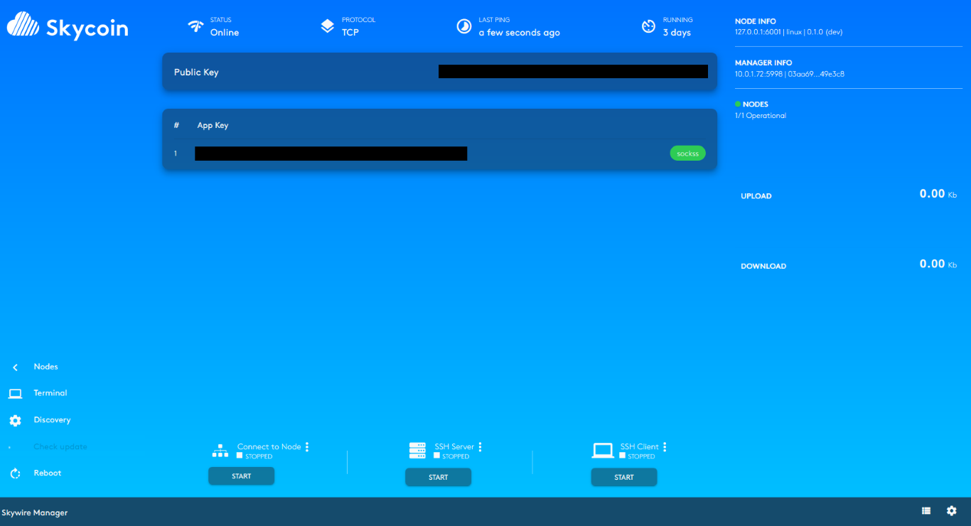 You have to be online for a month to get paid for you're node. It has to be up for > 75% and the reward is 2.8 Skycoin.