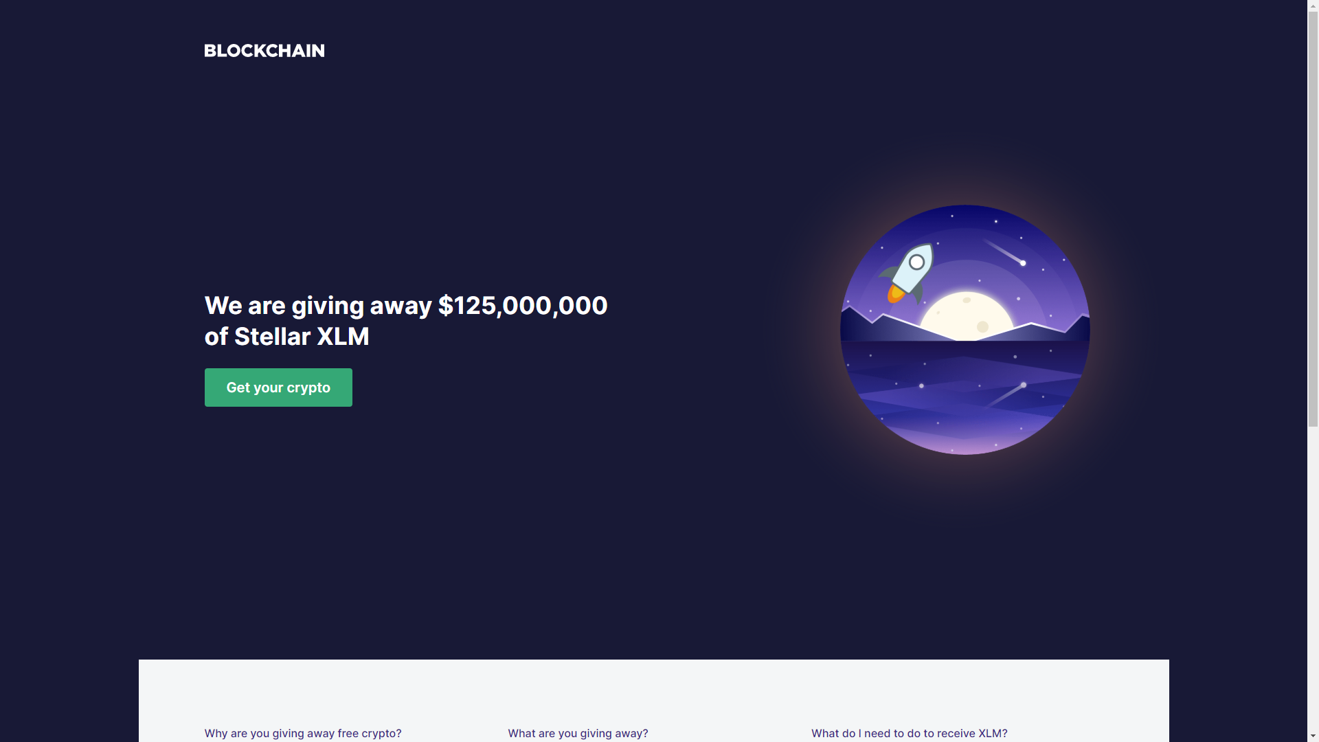 Blockchain.com is giving away free crypto, join now and clain your part of the Stellar XLM. If you don't have an account yet, you will have to sign up and validate your account to get your free crypto.