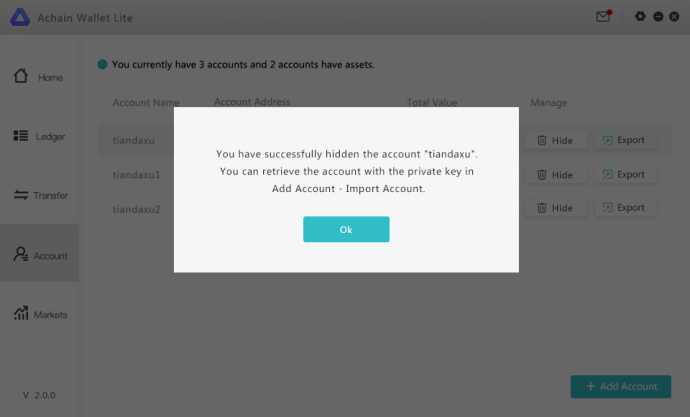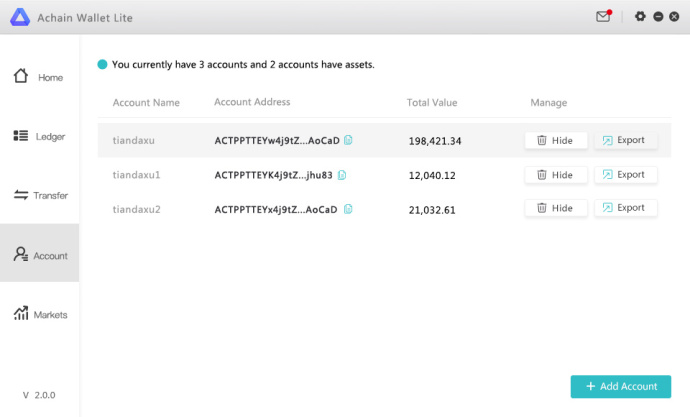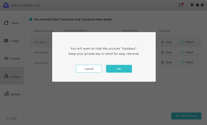 If you are a user who operates out of multiple accounts, an account management function has been added to this update. This function will allow the user to view account details and the assets held within them. Accounts may now be hidden to address any privacy concerns. Users can export a private key for their account in the interface. After an account is hidden, the same private key may be imported again to restore the account.