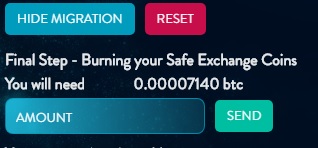 Enter the amount of Safex you want to burn and click send , make sure you have the required amount of BTC to perform. Check the target Migration address is the correct one also. It should be address that you have saved in your TXT file along with the keys