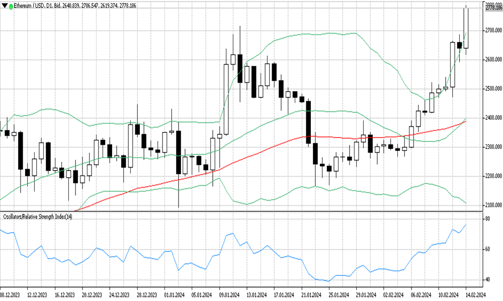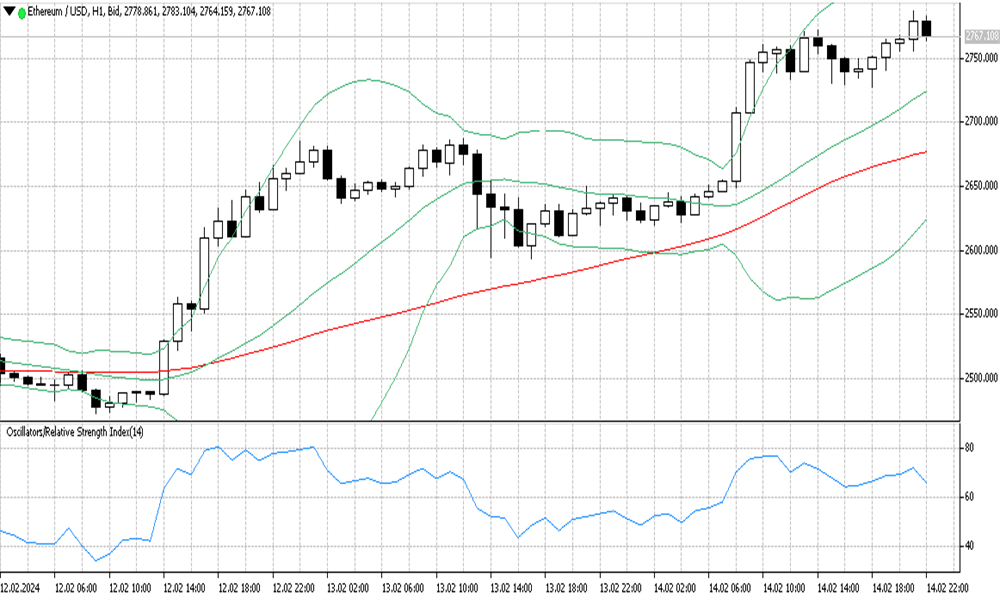 ETHUSD price is now at 2769.307 on Ticktrader FXOpen, the price successfully broke the upper band line and is outside the band line. This indicates that market volatility is very strong.