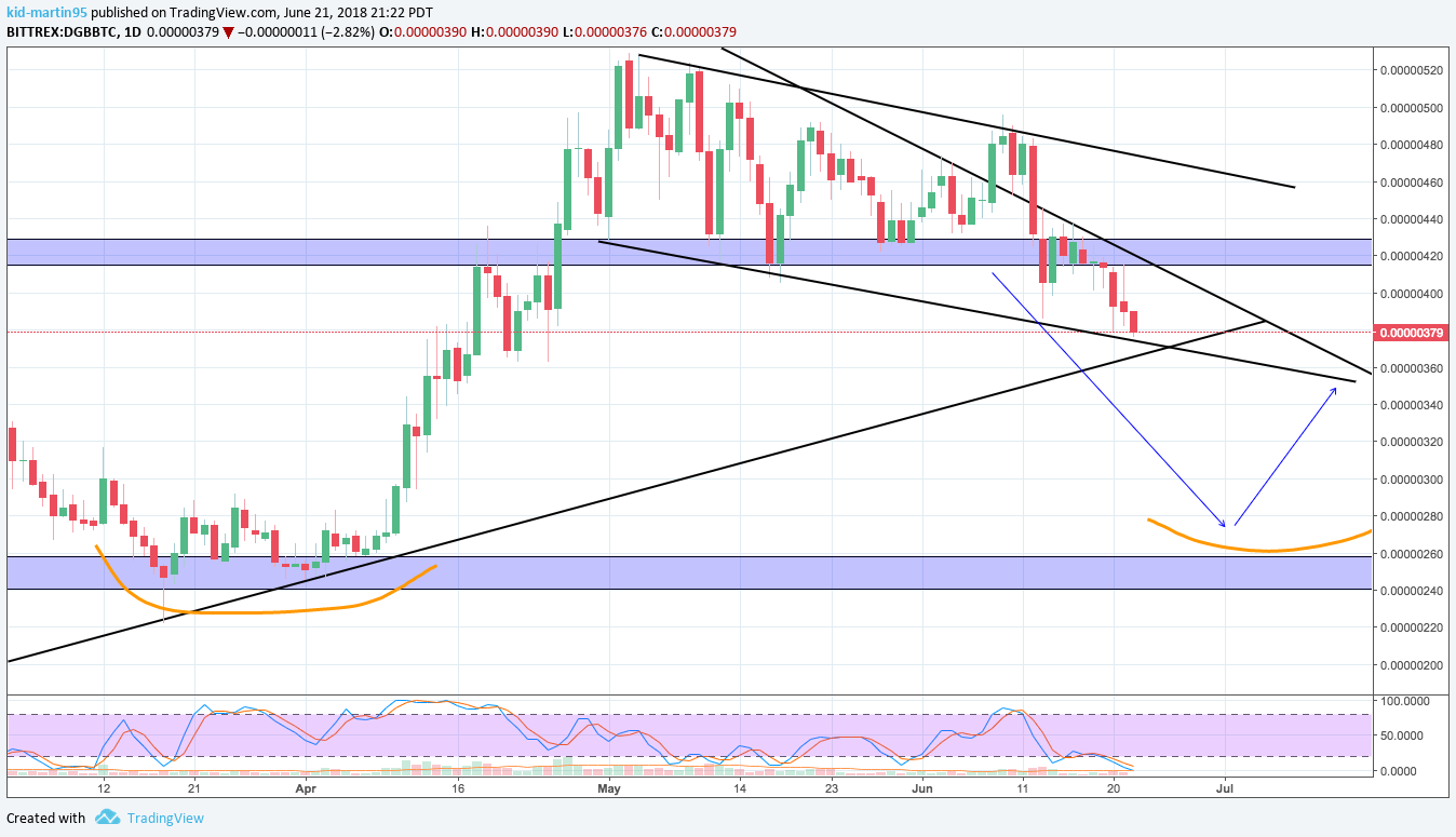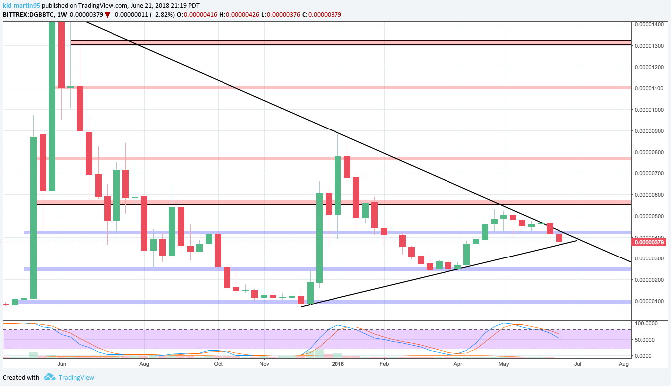 Looking at our trend timeframe we see price respecting our major downtrend and uptrend support, DGB is now at a critical point. Momentum showing us we are heading towards the downside and not slowing down, price should be following. Expecting a drop towards our major support zone 250 satoshis