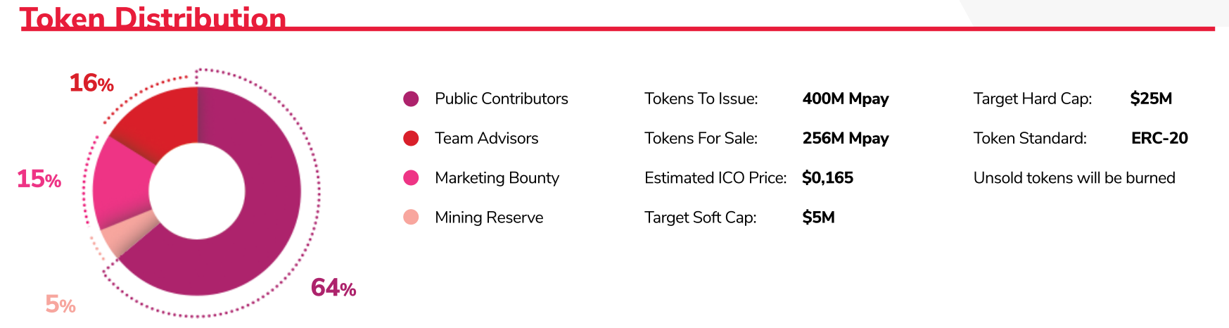Some good and some average things to say about this token distribution. 64% in the token sale along with 15% bounty is very very good. That's 79% of the tokens going into decentralized hands and should help make this token more stable once it becomes publicly traded. 16% to the Team and Advisors which is a very fair amount, the only problem here is there isn't a vesting period stated for the Team or Advisors (hopefully this will be addressed and added in the full whitepaper). Unsold tokens will be burnt is always a good thing, less tokens means yours are more valuable.
