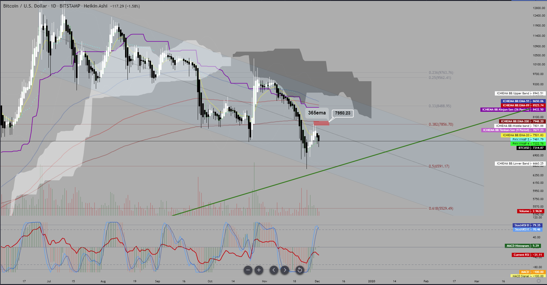 If price holds and starts to confirm a move up, the Fibonacci Extension of the previous two waves places the 0.5 and 0.61 extension levels at 7800/8000 just above the cloud. This price also aligns with the 365ema on the daily chart as see below.