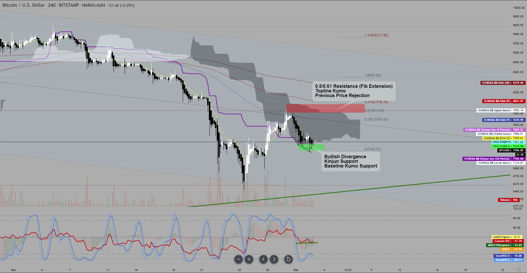 The VWAP is sitting around 7350 combined with the baseline of the cloud, midline of channel, and the 0.38 retracement all acting as resistance against the bullish divergence. Above that we have the Kinjun and 0.50 retrace slight above the topline of the kumo around 7460.